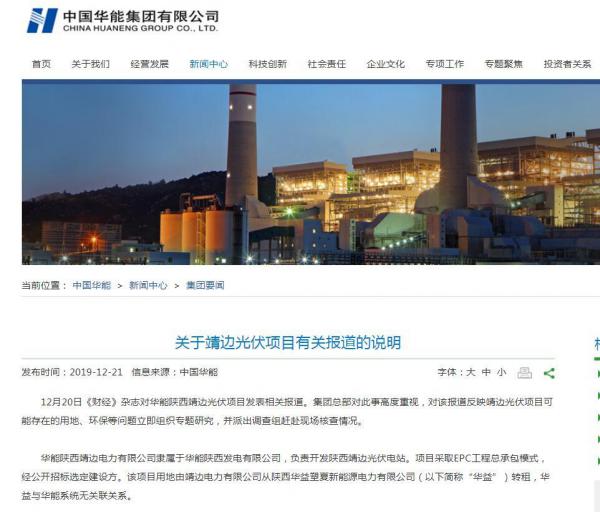 华能集团表示,近日媒体对华能陕西靖边光伏项目发表相关报道。集团总部对此事高度重视,对该报道反映靖边光伏项目可能存在的用地、环保等问题立即组织专题研究,并派出调查组赶赴现场核查情况。