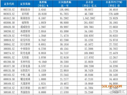按照wind光伏产业链分类,取得以下数据。光伏概念股走势较之今年大热的半导体、科技股自然是无法比的,但是可以看到也是跑出了几只“绩优股”的。