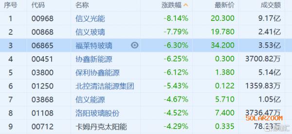 光伏玻璃股逆势下跌,市场占有率最大的信义光能(0968.HK)领跌,低见20.1港元,现报20.3港元,跌幅逾8%;福莱特玻璃和信义玻璃分别跌6.3%和7.79%。而福耀玻璃(03606.HK)现大涨近15%。