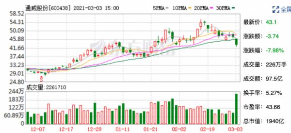 3月3日盘中,光伏龙头通威股份(600438)一度跌停,收盘下跌7.98%。盘后数据显示,沪股通买入7.61亿元并卖出6.29亿元,一机构席位买入1.98亿元,三机构席位合计卖出17.12亿元。