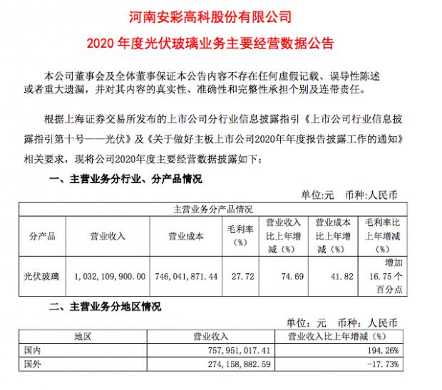 公告称,公司光伏玻璃经营数据较上年同期增加的主要原因为:公司全资子公司900t/d光伏玻璃退城进园项目于2020年一季度稳定运营,产能规模同比增加;通过对900t/d光伏玻璃生产线技术升级改造,高附加值产品产销量提升;光伏玻璃产品价格上涨。