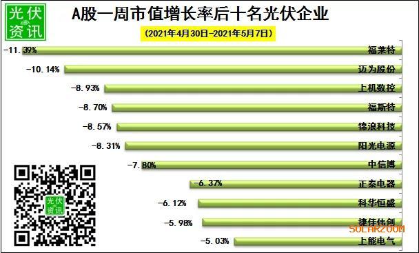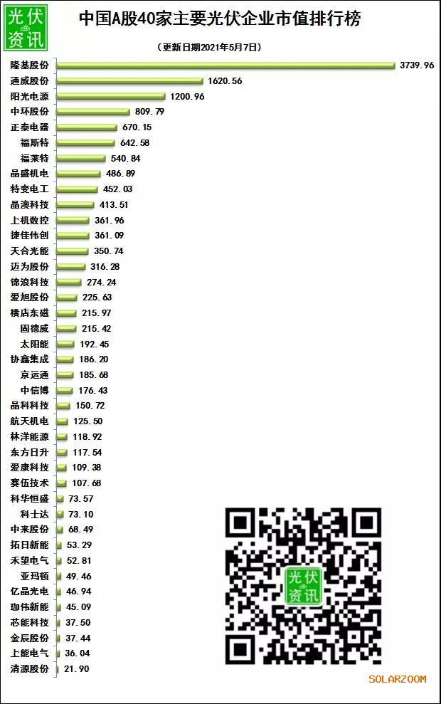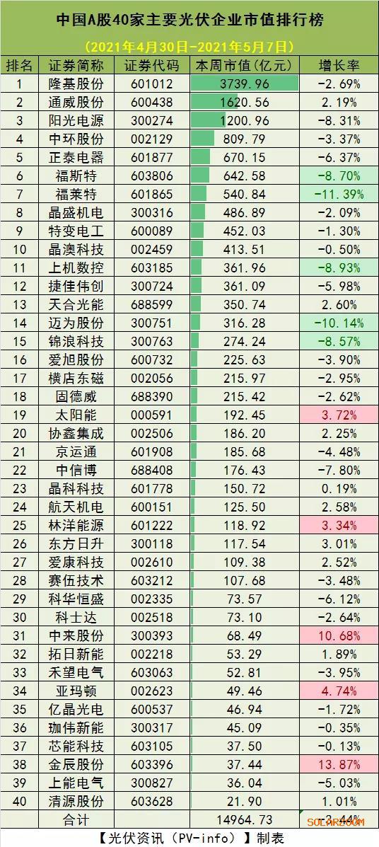 截止2021年5月7日下午收盘,40家光伏企业市值总计14964.73亿元,比上周下跌533.27亿元,本周下跌3.44%。