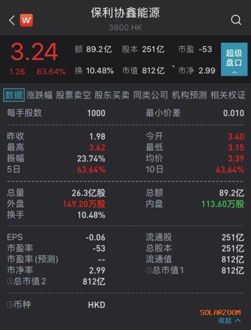11月1日,停牌7个月之久的保利协鑫能源在香港联交所恢复交易,截至发稿,保利协鑫能源大涨63.64%至3.24港元/股。盘中涨幅一度超82.83%,市值最高突破900亿港元。