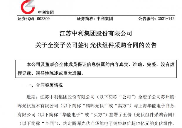 11月14日,中利集团公告,近期,全资子公司腾晖光伏与华能电子签署了五份《光伏组件采购合同》,约定腾晖光伏向华能电子销售总价超17亿元的光伏组件,占公司最近一期经审计营业收入的18.9%。
