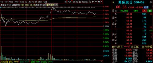 截至目前,通威股份当天上涨5.39%,报60.25元/股,成交额已经突破112.3亿元。最近几日通威股价放量拉升,逼近7月上旬的历史高点。