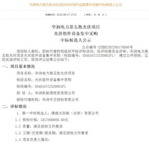 8月17日,华润电力公示第五批光伏组件集采中标候选人,通威太阳能(合肥)有限公司、常州亿晶光电科技有限公司、隆基乐叶光伏科技有限公司3家企业入围。