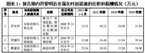 如图表1所示,报告期内,符黎明在公司任职的近亲属中,曹建忠(符黎明姐姐的配偶)现任时创能源副总经理,符涛(符黎明姨妈李琴芳之子)曾任监事会主席、现任采购经理,左军(符黎明表妹孙霞的配偶)曾任副总经理、现任对外关系负责人。