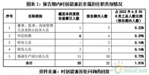 从任职类别情况看,如图表2所示,截至2022年11月14日,时创能源实控人近亲属担任董监高及核心人员的有1人、担任中层经理的有6人,曾担任财务人员的有2人。
