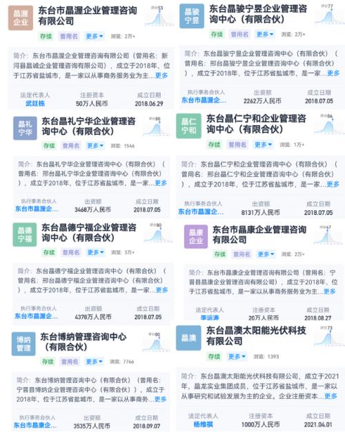 根据晶澳科技的中报以及天眼查系统,笔者发现,在晶泰福之前,至少还有七家公司,分别从邢台及宁晋、新河等地,迁到了东台市。这些公司注册于2018年6月-9月,并集中于2021年7月完成了变更手续。这些公司大都是“晶“字辈,分别是晶渥、晶骏、晶礼、晶仁、晶德、晶康(为东台博纳执行事务合伙人)等。小股东变更完成后,大股东晶泰福相当于是最后一家完成变更的。