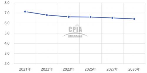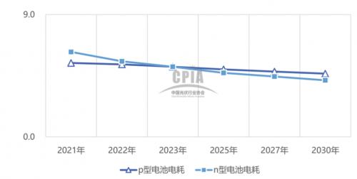电池电耗变化趋势(单位:万kWh/MW);来源:CPIA