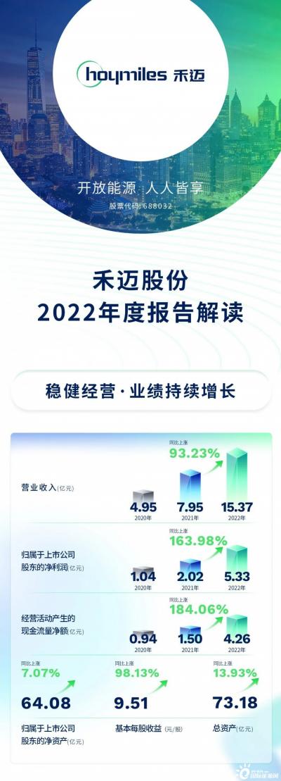 4月26日,禾迈股份发布2022年度报告,公司实现营业收入15.37亿元,同比增长93.23%;实现归母净利润5.33亿元,同比增长163.98%;实现基本每股收益9.51元/股,同比增长98.13%。