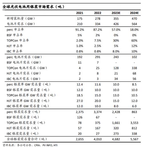 根据银浆另一龙头企业聚和材料的数据显示,截至2023年4月公司PERC的单耗约为9mg/w,TOPCON的单耗约为12-13mg/w,HJT低温银浆的单耗超过15mg/W。