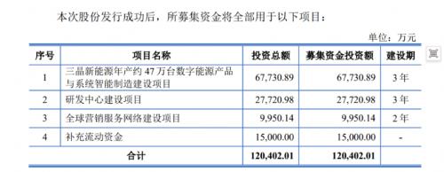 此次三晶股份的募资计划投入方向为:数字能源产品与系统智能制造建设、研发中心、全球营销服务网络等方,总计预计将募集资金投入12.0402亿元。