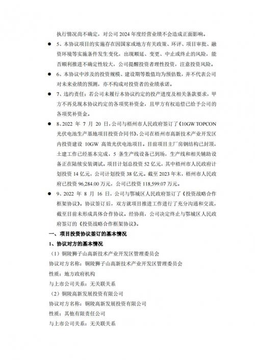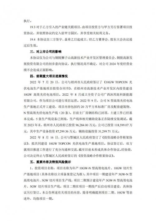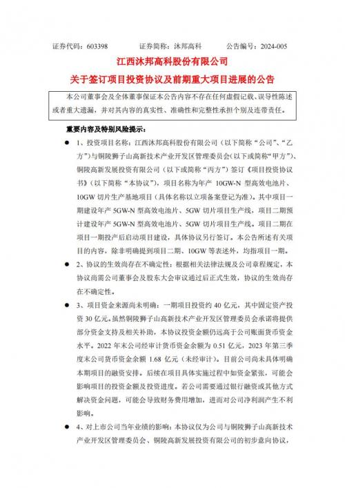 1月14日,沐邦高科公告,与铜陵狮子山高新技术产业开发区管理委员会(以下简称“狮子山高新区”)、铜陵高新发展投资有限公司签订《项目投资协议书》,将投建年产10GW-N型高效电池片、10GW切片生产基地项目,总投资额约70亿元。