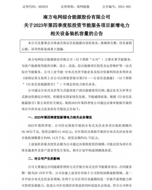 南网能源1月18日晚间公告,2023年第四季度,公司经决策拟开展的分布式光伏业务项目装机规模约38.09万千瓦,投资总额约13.94亿元;全年度经决策拟开展的分布式光伏业务项目装机规模累计约89.14万千瓦,投资总额约35.75亿元。