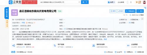 近日,企查查显示,连云港赣榆东赣光伏发电有限公司成立,法定代表人为何悦,注册资本100万元,经营范围包含:许可项目:建设工程施工;发电业务、输电业务、供(配)电业务(依法须经批准的项目,经相关部门批准后方可开展经营活动,具体经营项目以审批结果为准)一般项目:太阳能发电技术服务;储能技术服务;技术服务、技术开发、技术咨询、技术交流、技术转让、技术推广。