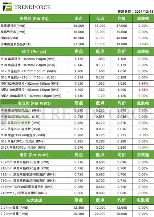 供需动态:12月组件排产下修,海内外均临近假期,需求相对萎靡,组件厂1季度接单情况难言乐观,不少厂商有提前休假或延长假期的打算。国内市场,集中式步入尾声,拉货力度较弱;海外,圣诞假期临近,工人放假,项目安装趋缓。
