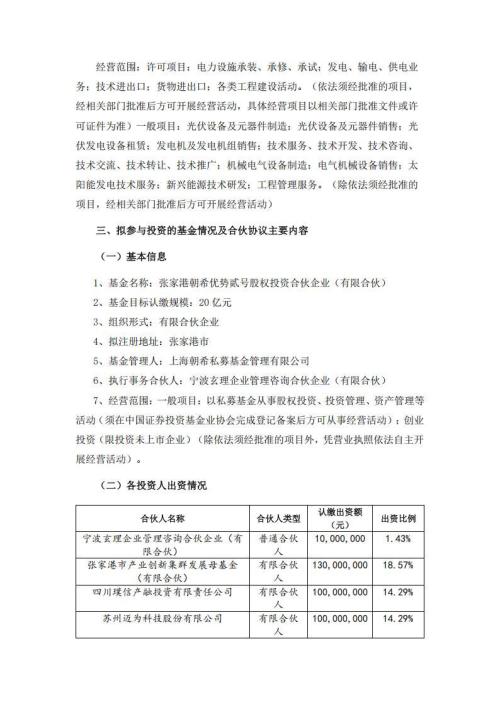 公告显示,为进一步拓展公司业务领域,更好地借助专业机构的专业力量及资源优势,整合各方资源,提高公司的综合竞争力。迈为股份拟与专业投资机构上海朝希私募基金管理有限公司、宁波玄理企业管理咨询合伙企业(有限合伙)及其他有限合伙人进行合作,公司拟作为有限合伙人以自有资金认缴出资10,000万元,参与认购张家港朝希优势贰号股权投资合伙企业(有限合伙)的基金份额。