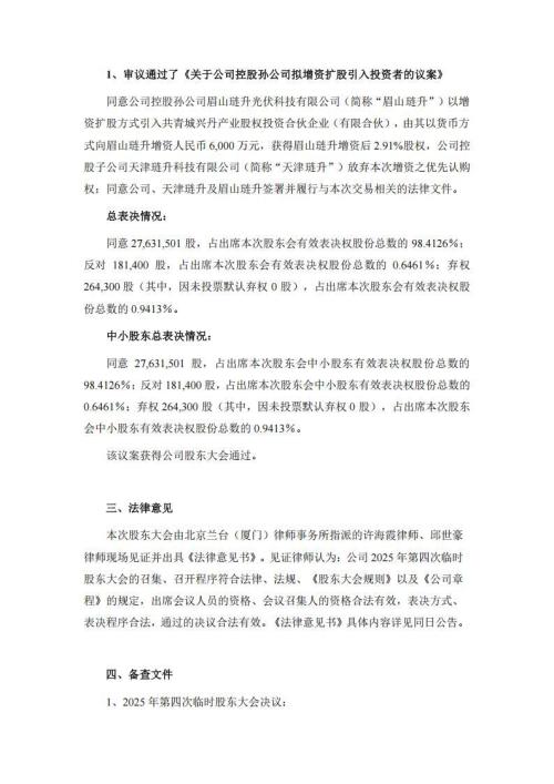 琏升科技股东大会同意控股孙公司眉山琏升光伏科技有限公司(简称“眉山琏升”)以增资扩股方式引入共青城兴丹产业股权投资合伙企业(有限合伙),由其以货币方式向眉山琏升增资人民币6,000万元,获得眉山琏升增资后2.91%股权,琏升科技控股子公司天津琏升科技有限公司(简称“天津琏升”)放弃本次增资之优先认购权。