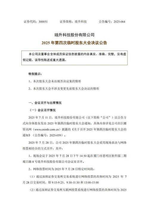 7月28日,琏升科技发布2025年第四次临时股东大会决议公告。