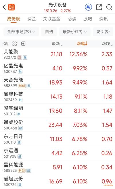 光伏设备涨幅TOP20