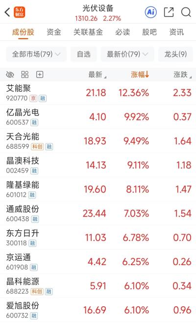 光伏设备板块在10月14日早盘走强,早盘收盘时上涨2.27%。板块中亿晶光电涨停,艾能聚大涨超10%,天合光能、晶澳科技、隆基绿能、通威股份等行业龙头也纷纷涨幅靠前。