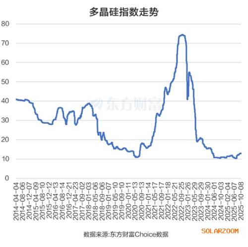 东方财富Choice数据显示,多晶硅指数10月13日报13.这较2024年底的10.67上涨21.84%。