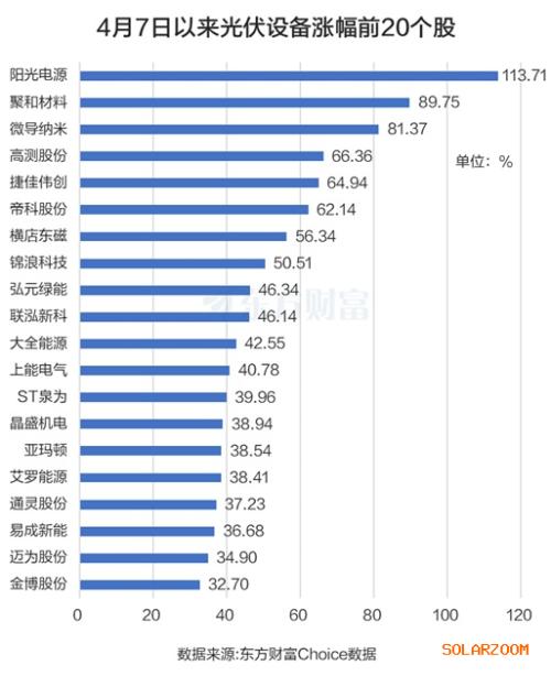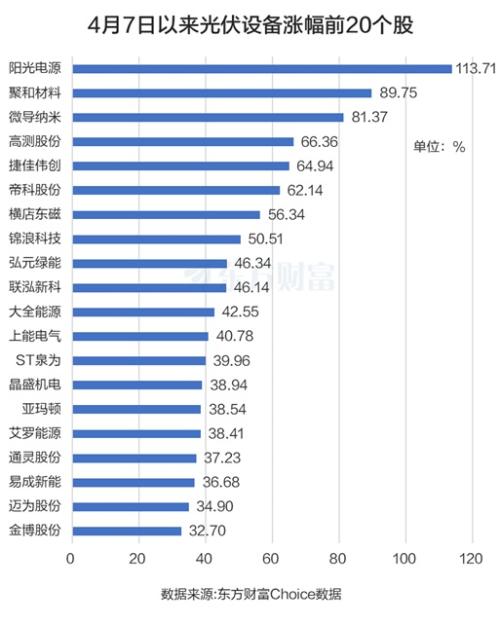 从股价表现来看,东方财富Choice数据显示,4月7日以来光伏龙头阳光电源(最新市值2978亿元)股价翻倍,累计上涨113.71%。聚合材料紧随其后,上涨89.75%。微导纳米也累涨超过80%,为81.37%。