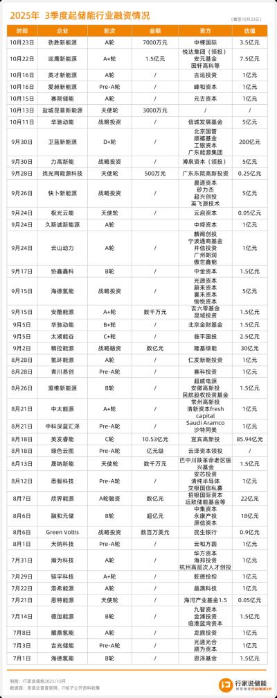 聚焦第三季度,从融资规模上看,储能融资市场英发睿能(主要光伏、涉及储能)融资超10亿元成为榜首;其次为巡鹰、精控能源、融和元储等获得亿元级融资的企业。
