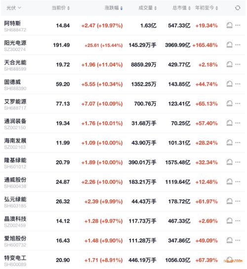 个股方面,光伏主产业链企业以及逆变器企业全线暴涨。其中,隆基绿能、通威股份、弘元绿能、晶澳科技、阿特斯强势涨停,阳光电源涨超15%,天合光能涨超11%,固德威、艾罗能源涨超10%,爱旭股份接近涨停,特变电工、上能电气、双良节能等涨超8%。