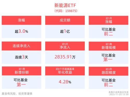 截至11月4日,新能源ETF近6月净值上涨64.79%,指数股票型基金排名185/3845.居于前4.81%。从收益能力看,截至2025年11月4日,新能源ETF自成立以来,最高单月回报为25.07%,最长连涨月数为6个月,最长连涨涨幅为67.53%,上涨月份平均收益率为8.57%。