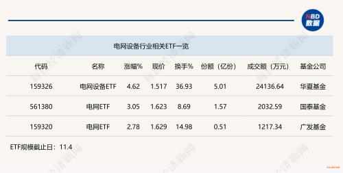 点评:电网设备ETF(159326)今日上午涨幅达到4.62%,其份额为5.01亿份,半日成交金额达到2.41亿元,其追踪的是中证电网设备主题指数。