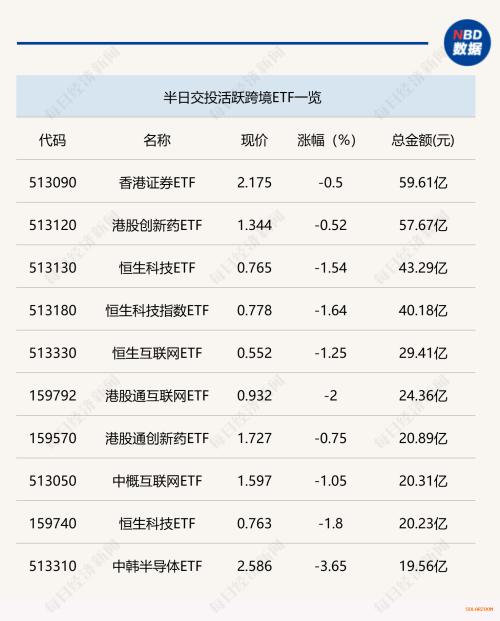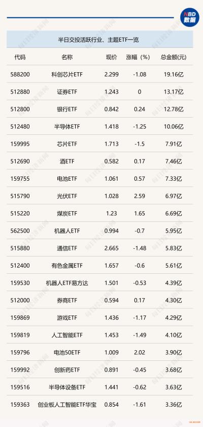 今日上午,行业、主题ETF表现平淡,科创芯片、证券、银行以及半导体ETF交易相对活跃,但成交金额均未超过20亿元。跨境ETF方面,香港ETF(513090)和港股创新药ETF(513120)保持交易热度,半日成交金额超过50亿元。