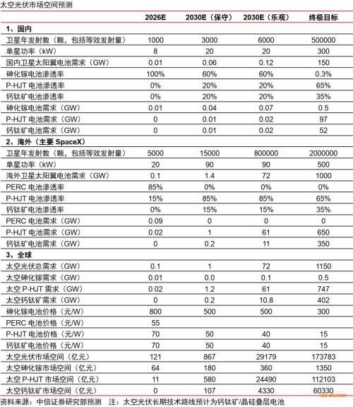 中信证券表示,SpaceX引领商业航天发展,加快星链(Starlink)建设和卫星升级,并申请部署百万颗卫星,正式进军太空数据中心。太空光伏是现阶段卫星和轨道算力的唯一能源,其需求增速和市场空间有望迎来指数级增长。中信证券测算,在保守情景下,2030年全球太空光伏需求量和市场空间或分别达1GW和800亿元以上;在乐观情景下,2030年全球太空光伏需求和市场空间或分别达70GW和近3万亿元。中信证券预计,未来5年,太空P型HJT和钙钛矿电池市场成长空间或达百倍、甚至千倍以上。