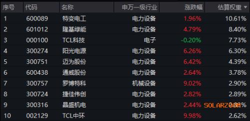 光伏ETF汇添富(516290)标的只是成分股多数冲高,聚和材料20cm涨停,协鑫集成连收4个涨停板,TCL中环10cm涨停,爱旭股份、罗比特科等涨超9%,隆基绿能涨超4%,捷佳伟创、晶盛机电等涨幅居前。