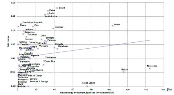Climatescope国家在2013年的可再生能源投资总额为1220亿美元,而2007年仅为593亿美元。55个国家通过了超过450项跟可再生能源相关的措施,其中,南非、肯尼亚和乌干达都有大型清洁能源项目和投资计划。南非在2013年大约有17个项目中标,过去两年的可再生能源投资大约100亿美元。