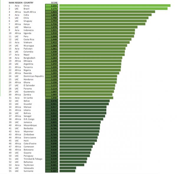 研究结果表明,中国在ClimateScope国家中排名第一。据彭博新能源财经中国首席能源研究顾问应俊解释,一个国家的排名取决于许多因素:该国的清洁能源投资政策、市场条件、电力行业结构,在清洁能源领域运作的本地公司的数量及构成情况,以及对温室气体减排所做的努力等。