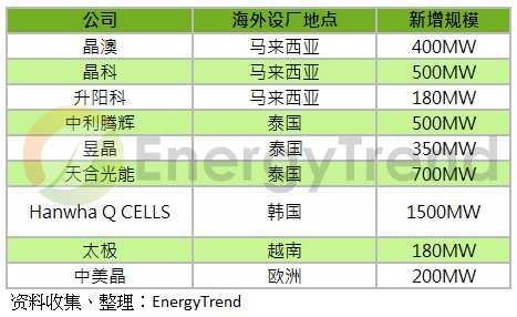 根据EnergyTrend的调查研究,许多厂商今年上半年已纷纷宣布将在东南亚或韩国等地新设产能,在不计印度新增产能的情况下,2015年年底前,仅此亚太区域的电池产能估计将达4.5GW,只要年底前能顺利开出产能,就足够供应美国所需。因此,在这些产能开出后,海外电池的供需可望达到较平衡的状态,使得中国、台湾生产的电池价格面临下跌压力。