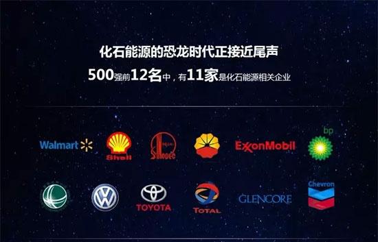 如果我们把视野转到我们的经济社会,2015年的500强前12名当中,你会发现有11家是化石能源相关的企业,其中9家是化石能源的生产和交易商。