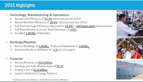 First Solar首席执行官吉姆·休斯(Jim Hughes)表示:“我们2015年的年度收入创纪录,新订单量创纪录,每股收益超过五美元。当我们回望首次在近三年前我们的分析师日向投资者提供的2015年目标时,我们意识到,我们已经实现当时概述的效率、每瓦成本及收入目标。我们凭借绝佳技术、强劲项目储备以及不断致力于实现我们传达给投资者的长期目标进入2016年。”