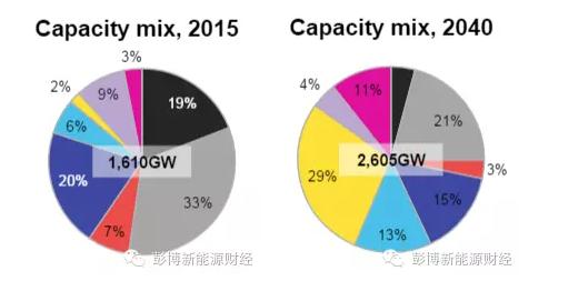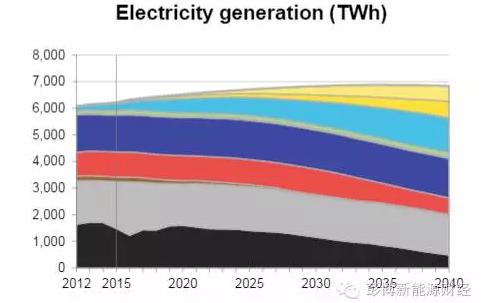 提升发电装机容量:可再生能源发电的大规模扩建和能源效率的提升将带来总发电装机容量的大幅攀升,但与此相比实际用电量只有小幅提升。总装机容量将增长62%,从2015年末的1610GW增至2040年的2605GW。但用电量将仅仅增长10%,从6232TWh增至6850TWh。