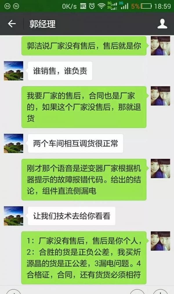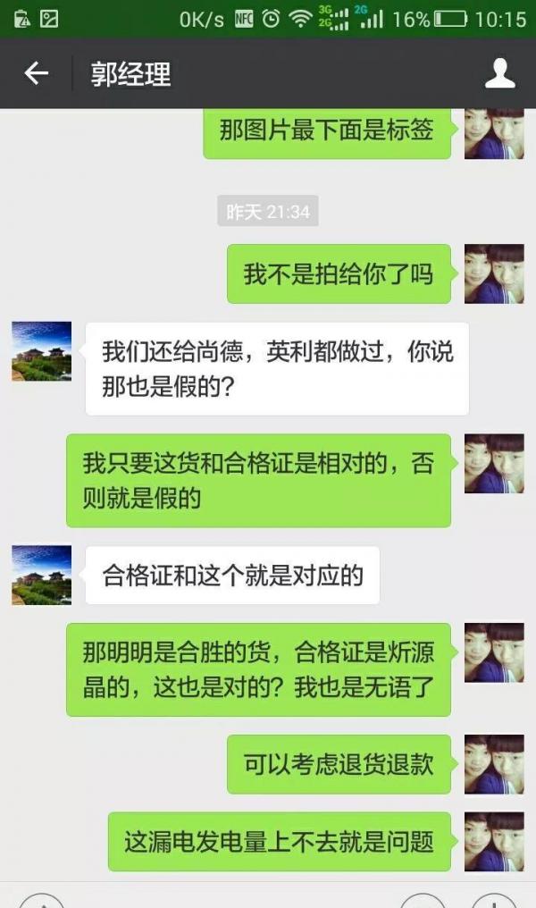 今天据河南洛阳的光伏朋友反映说:他们作为一个光伏系统集成商,他们公司从附近公司工厂拿的货,却发现合格证、合同是甲公司(炘源晶)的,条形码却是乙公司(和胜)的,收据也是该厂的财务章,还发现该厂没有售后!是谁销售谁售后!技术人员过来问我?这是我们的组件吗?再三问我!我就怀疑了,后来打该厂电话4006998060,得知该厂组件左上角玻璃内是swj开头的条形码,我这条行码是m142hs…其中hs是合生胜的!打厂家400电话,接电话的说厂家没售后,谁销售找谁售后!和销售主管核对,也证明了这一点!后来我找合胜,合胜说谁卖给你板子你找谁售后!通过这个事,我是再也不敢和小厂打交道了,因为制度不完善!现在售后都这么难,25年的售后更无法保障!如果炘源晶说你这条形码不是我们公司的,也就是说这假货!也不是不可能!因为谁愿意售后!如果这成为厂家拒绝售后的理由,25年售后期,厂家就完全逃避了售后!