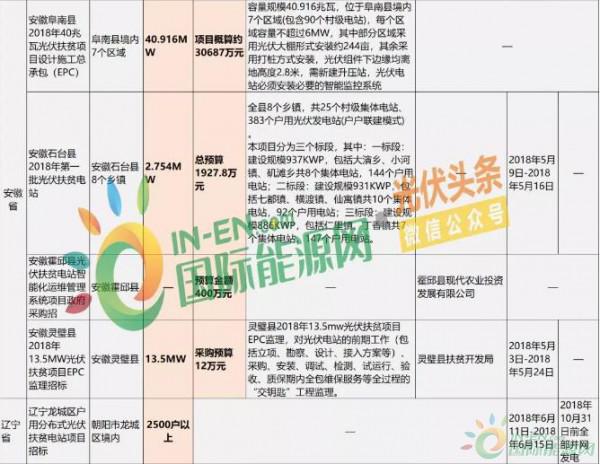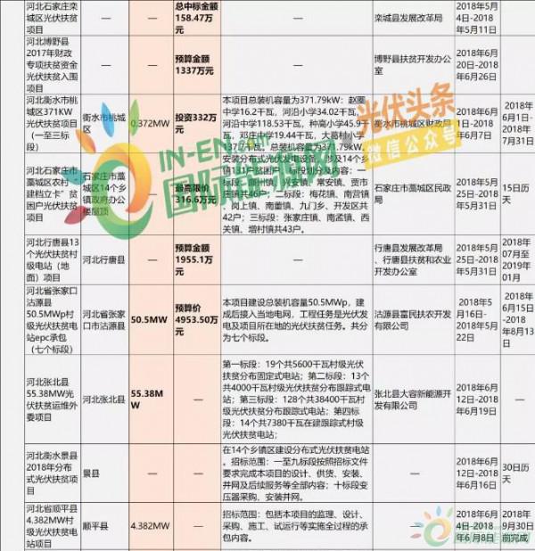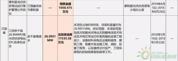 3)在531光伏新政之后,吉林省、河北省、山东省、山西省、甘肃省、辽宁省、江西省、河南省、青海省共9个省、26个光伏扶贫项目的获取招标文件时间定在光伏新政之后的6月份,预计建设规模约为242.1MW,投资/预算约为6.4亿元。