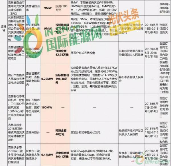1)广东省、吉林省、河北省、山东省、山西省、甘肃省、湖南省、浙江省、湖北省、陕西省、安徽省、辽宁省、江西省、黑龙江省、四川省、福建省、河南省、青海省等18个省共下发了76个光伏扶贫项目相关招标公告。