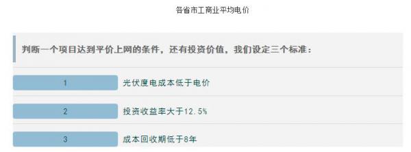 国家发展光伏的方向是坚定不移的,国家对光伏产业的支持是毫不动摇的,国家对于技术先进、发展质量高、不需要中央财政补贴的光伏发电项目规模是放开的,地方可根据接网消纳条件和相关要求自行安排建设。事实上,在广东、吉林、浙江、江苏、上海、北京,天津等省市,工商业平均电价超过0.8元/度,在工业商用电侧,光伏发电完全具备平价上网的基础。