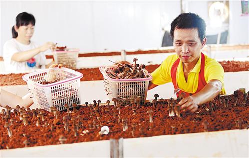 7月17日,江西省宜丰县新昌镇羿飞永徽公司菌农在采摘鸡枞菌。近年来,宜丰县依托良好的生态优势,大力发展“光伏+生态农业”,打造光伏发电与生态种养“一地多用”立体开发模式,形成了产购销一体化链条,助力农民增收。