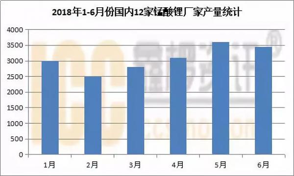 据鑫椤资讯统计:2018年1-6月份国内12家锰酸锂厂家产量共计18450吨,较去年同比增长25%左右,预计今年国内锰酸锂总产量将达5.5万吨水平,较去年同比将增长57%。从去年下半年开始,不少锰酸锂企业纷纷扩建产能,如湖南湖利、中信大锰、河北强能、中天光源、天津通一等,产品也纷纷往中、高端动力型锰酸锂发展。目前国内达到年产千吨级以上的锰酸锂企业有接近20家,随着今年新能源汽车退补效应显现,加上锰酸锂技术推进速度较快,该产品将逐步受到车企的青睐。