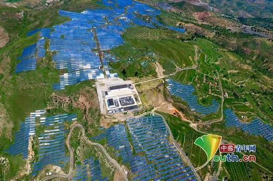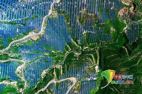 张家口怀来县逐渐关停了多个重污染煤矿,发展绿色能源。太阳能光伏发电群建在山体上,发电板铺满山体看起来相当震撼。