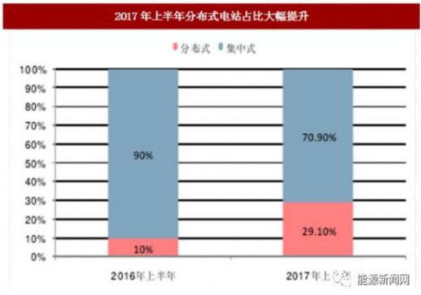 统计数据显示,截至2016年底,我国分布式电站在光伏总装机的占比为13.32%,远低于日本90.00%和美国83.00%,以及全球68.90%的水平。直到2017年上半年,我国分布式光伏在总装机的占比才由2016年上半年的10%提升到29.10%。