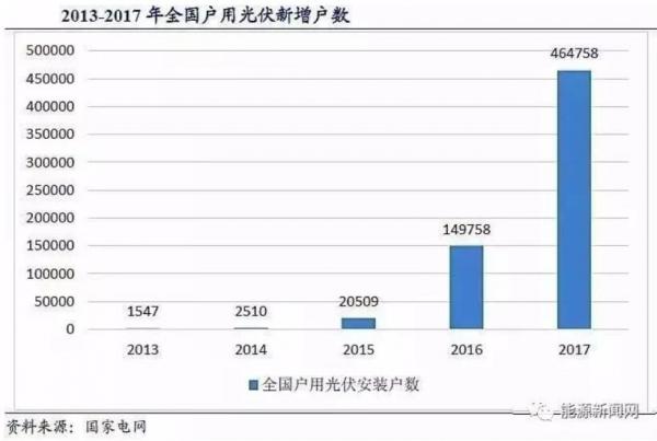 同时,作为分布式的生力军,户用光伏装机规模开始同步攀升,但在总装机中的占比仍处于较低水平。据国家电网公司发布的《促进新能源发展白皮书2018》显示,2017年我国新增户用光伏为464758户,是2016年149758户的3.1倍。此前,2013、2014和2015年的新增用户数分别为1547户、2510户和20509户。